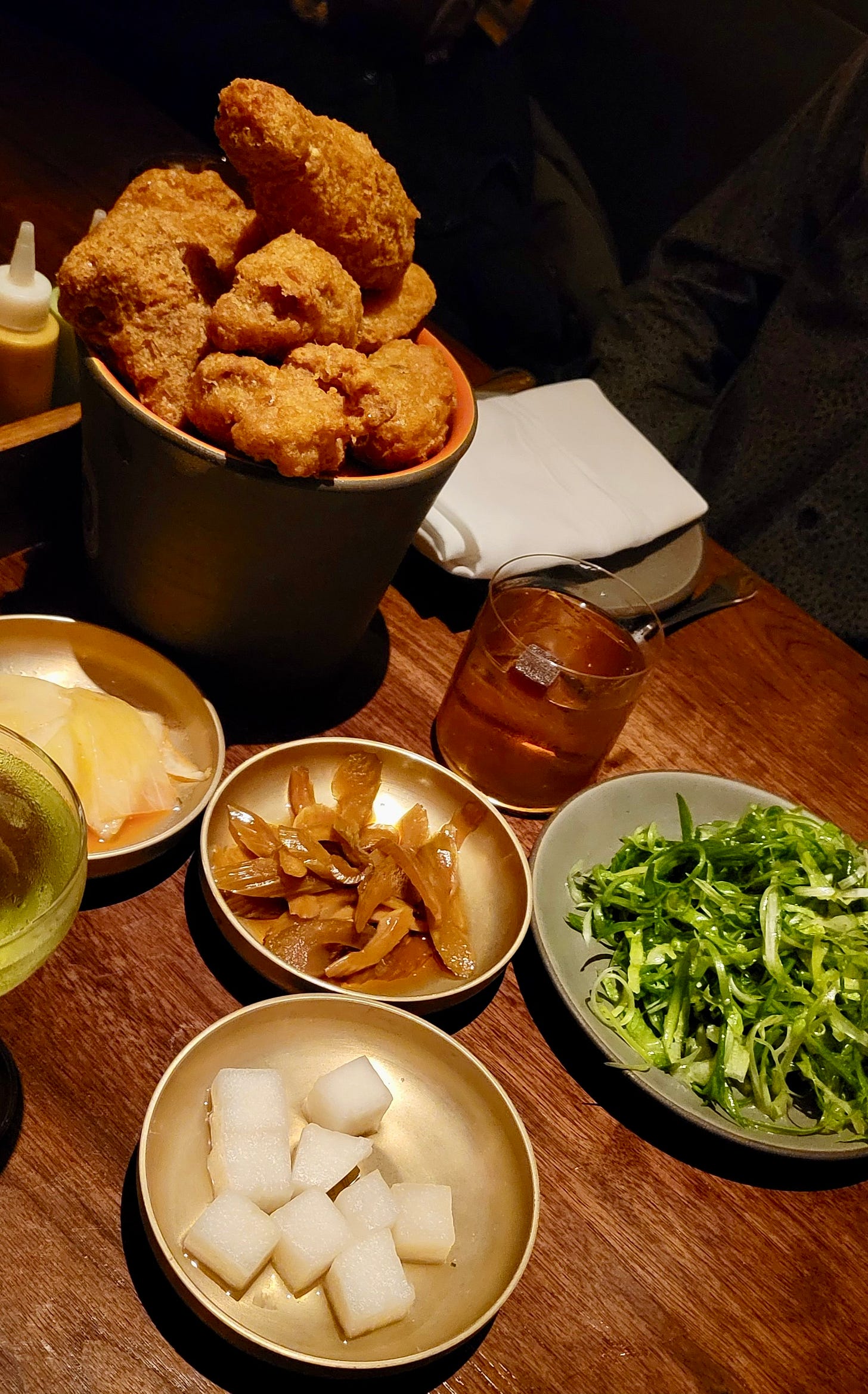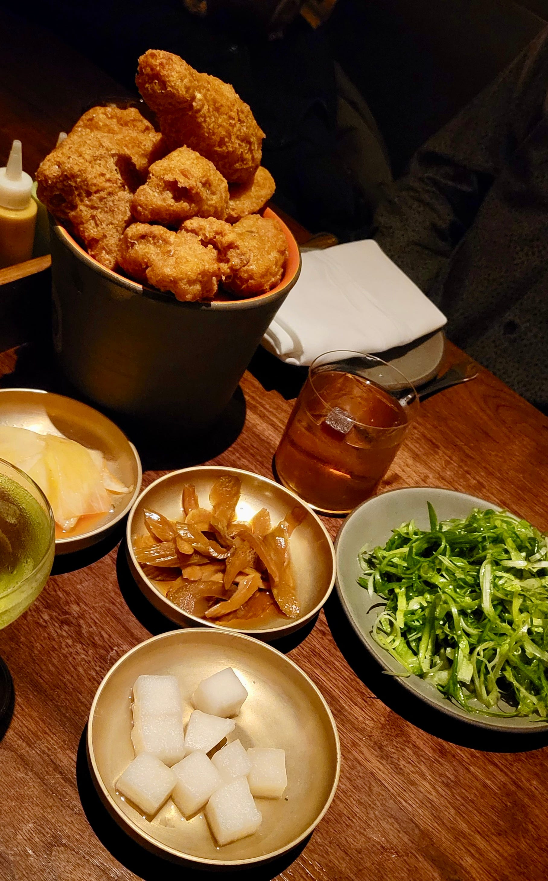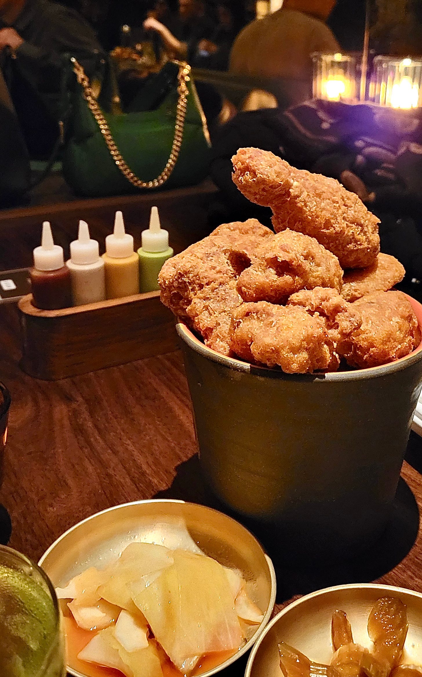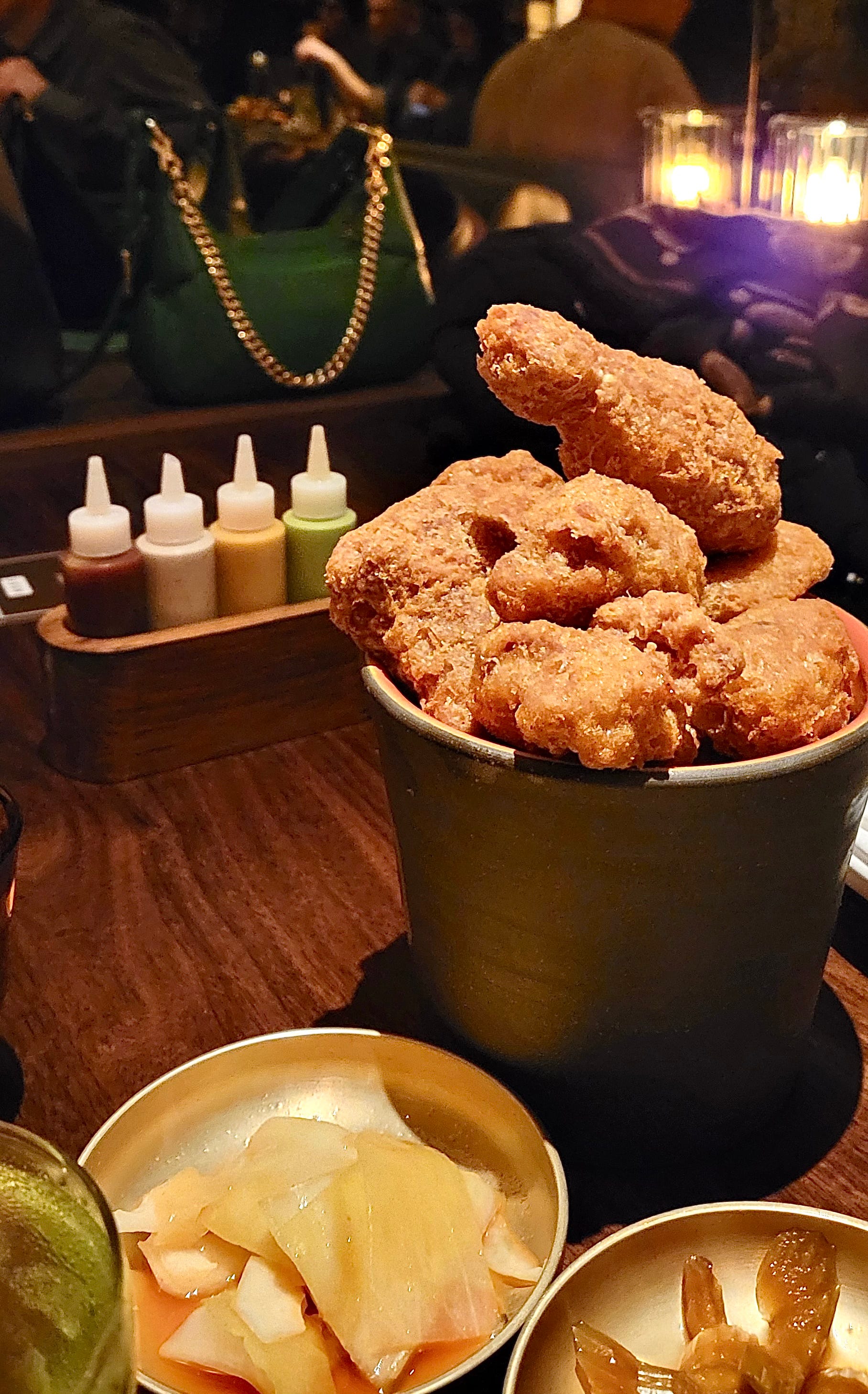 Food: The whole reason to go here is for their famous Bucket List. This is a $38 prefix per person, which includes a consomme to start, two buckets of fried chicken – one plain and one with your choice of either a soy sauce garlic glaze or a gochujang glaze, pickled vegetables and four dipping sauces as accompaniments, cold perilla seed noodles as a side, and frozen yogurt to finish. For a place that is so upscale and hard to get into, I thought this was a great deal. They do have other things on the menu that are a lot more expensive, including a tin of caviar for $870, but the Bucket List is really a must here.