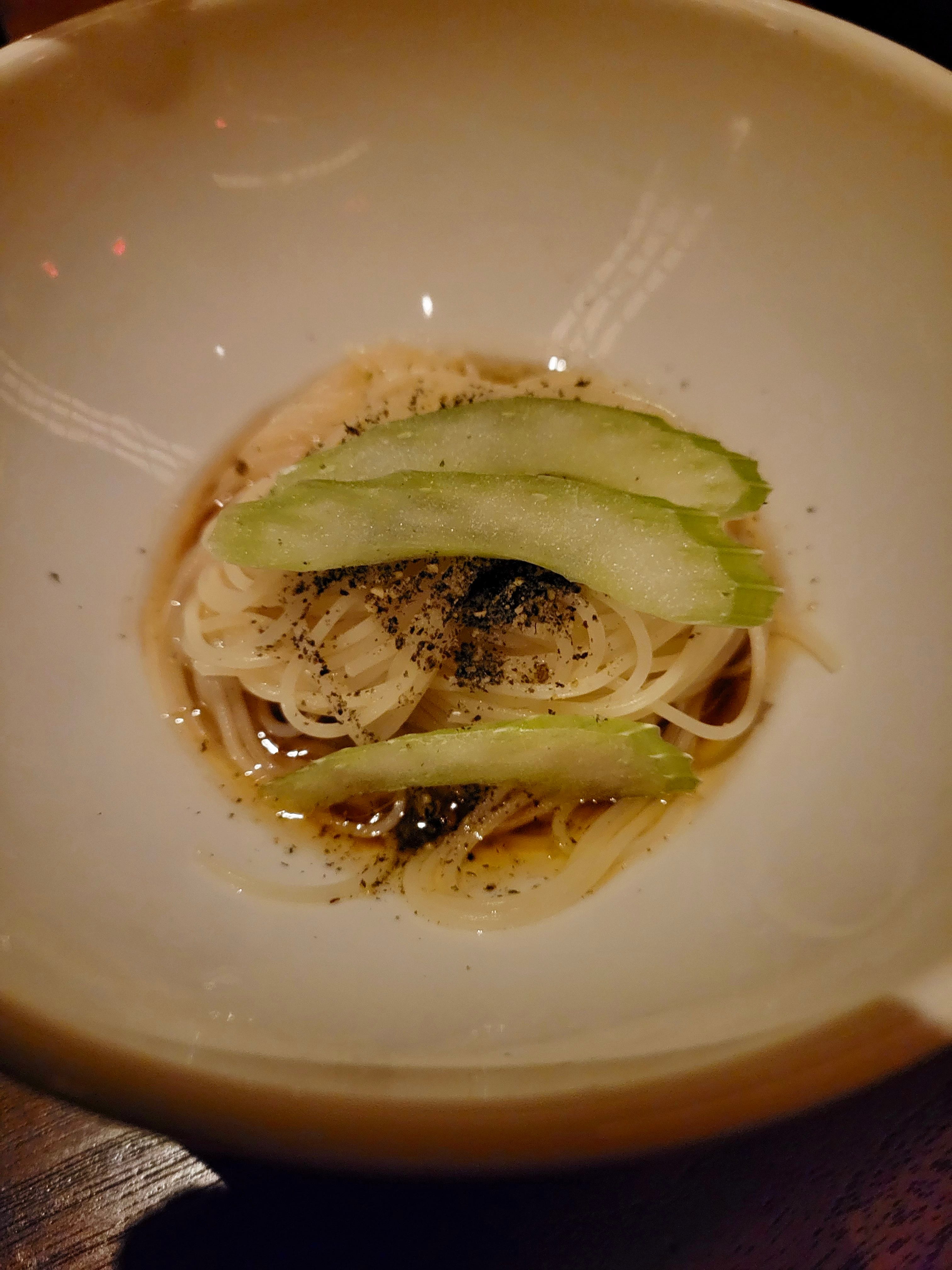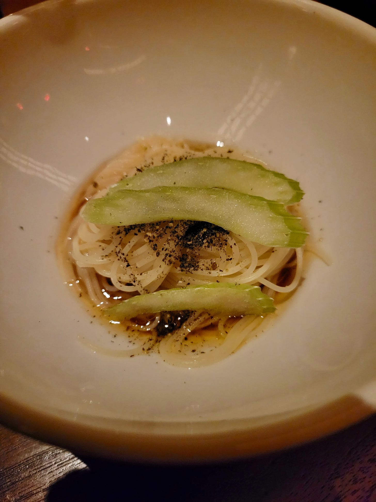 Next was the cold perilla noodles with celery and black pepper. Perilla is an herb often used in Korean cuisine that has a taste similar to mint. These noodles were shockingly good! They were in perilla soy sauce that had such a unique flavor, it kind of reminded me of matcha. I finished this dish within a minute and found myself sad that I did not have more of it.