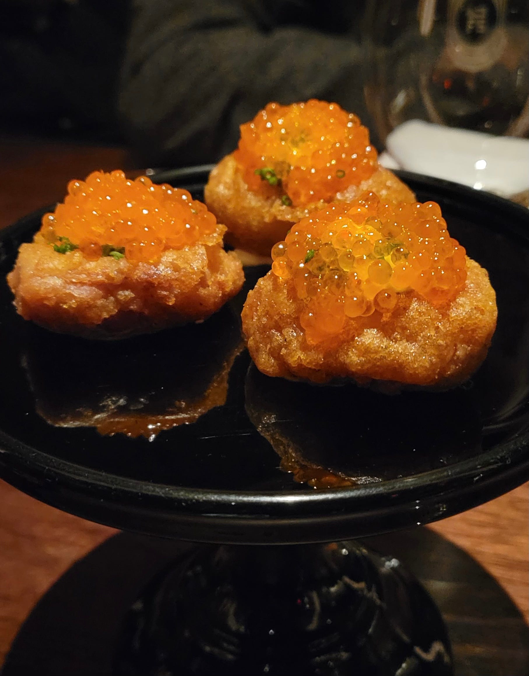 To start off, we each ordered a Golden Nugget (this is not part of the Bucket List), which is one chicken nugget with creme fraiche and ocean trout roe. The presentation of these chicken nuggets was beautiful, however I was a little underwhelmed by the taste. The chicken nugget had a weird consistency and the caviar didn’t really add much flavor. In terms of flavor, I would skip this dish, but if you are looking for the novelty of a caviar chicken nugget, it is definitely a fun experience.