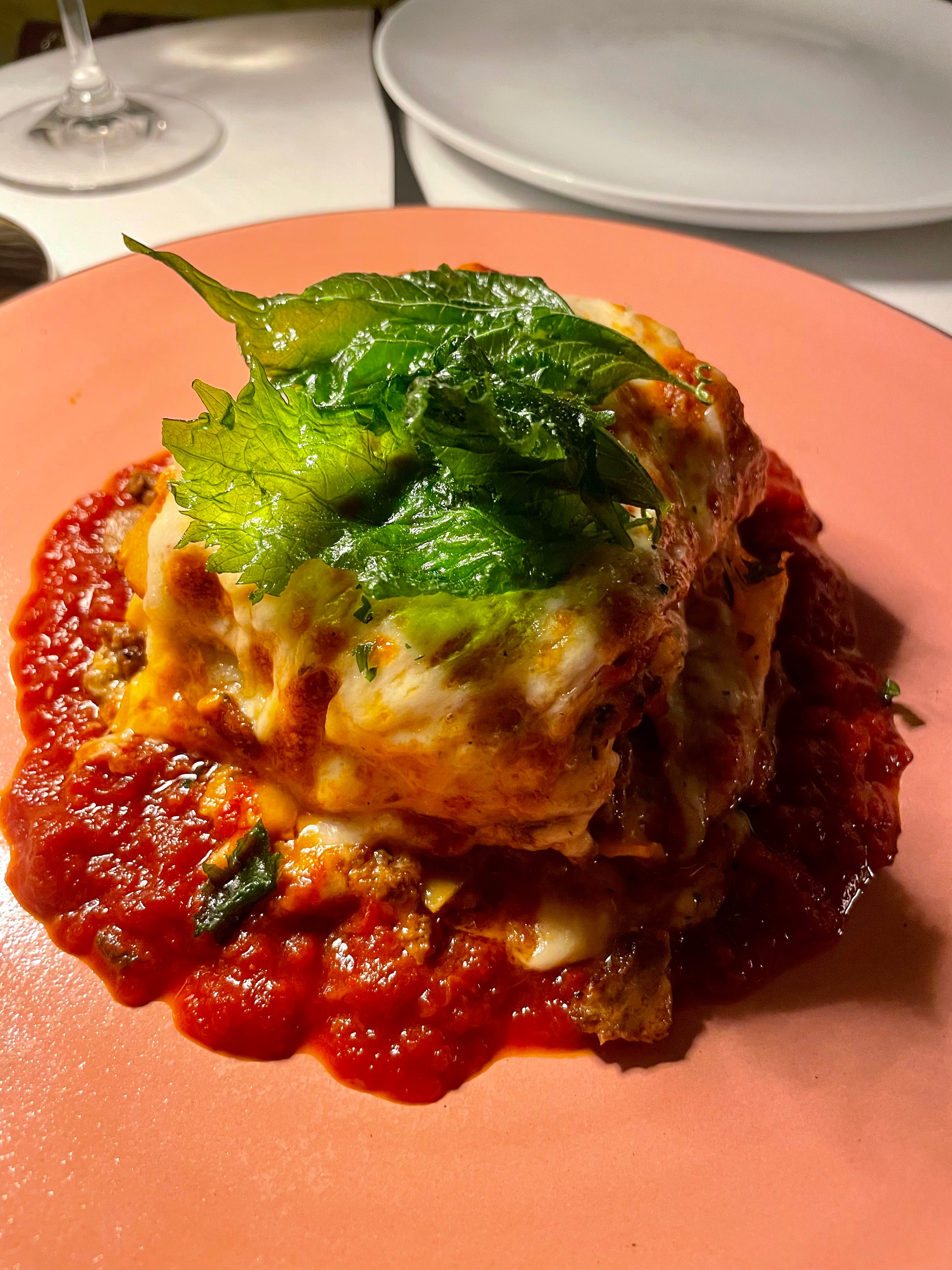 For the mains, we got the Kimchi Lasagna and the Chicken Parmesan. I really loved these two dishes and I am hungry all over again just writing this. Starting with the kimchi lasagna – lasagna noodles layered with bulgogi beef, mozzarella cheese, a cooked down kimchi tomato sauce and topped with a crispy perilla leaf. The lasagna had a slightly (but not overwhelmingly) sweet taste to it thanks to the bulgogi beef and cooked down kimchi that paired so well with the saltiness of the cheese. Every bite was full of so much flavor; it simply was such a great dish. The chicken parmesan came with a smoked vodka sauce, this was definitely my favorite dish of the night. I like to think of myself as somewhat of a chicken parm connoisseur and this was up there with Emilio’s Ballato (Emilio's Ballato Post). The chicken was very thin and crispy, just the way I like it. The vodka sauce was so decadent and creamy – I would eat it everyday if I could. And even though it says smoked vodka sauce, I didn’t get too much of a smoky flavor, which was even better for me.